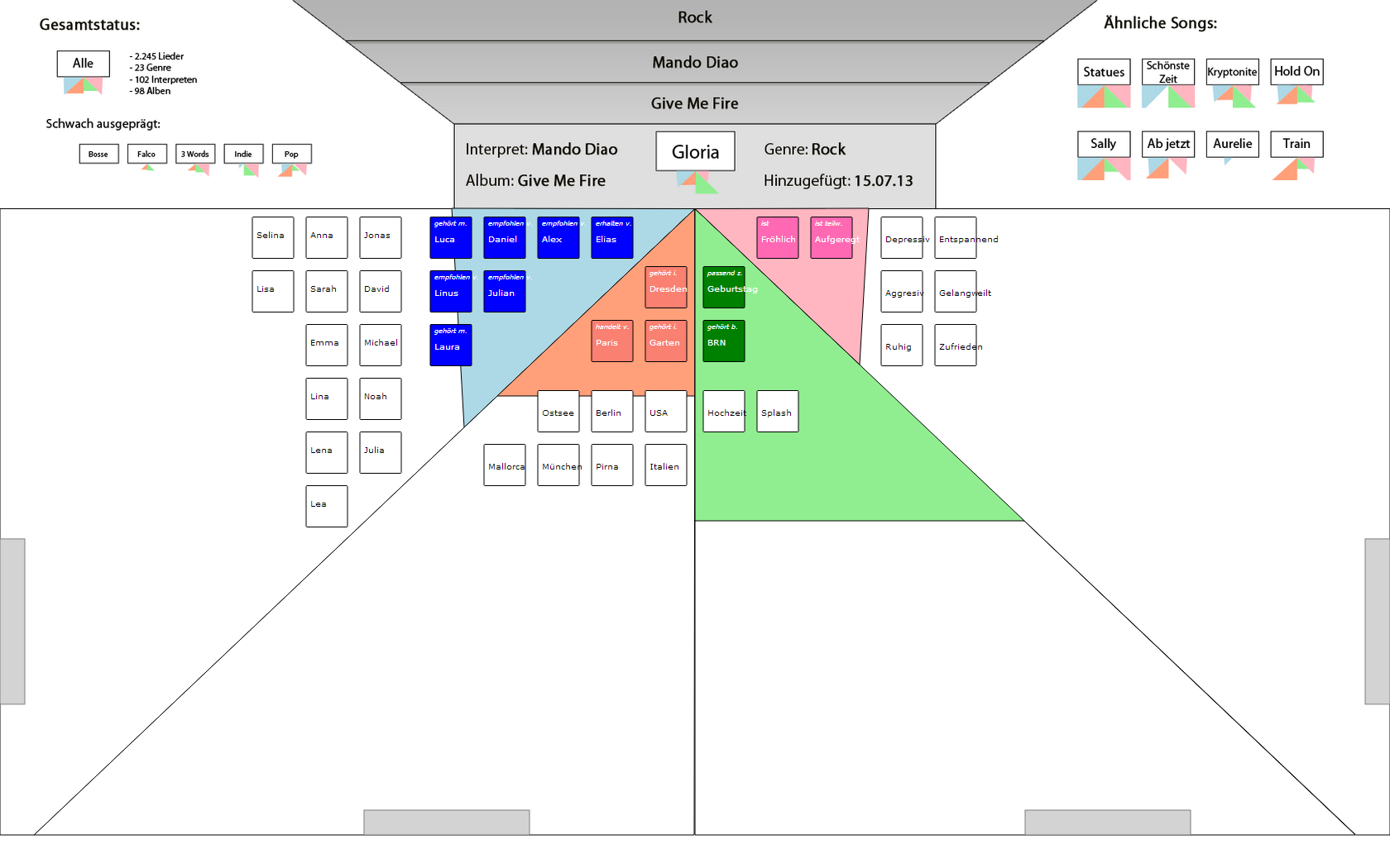 Diese Bachelorarbeit erarbeitet Konzepte, die die Visualisierung und die Interaktion für Ontologien zur Medienorganisation am Szenario einer Musiksammlung ermöglichen. Diese gewährleisten insbesondere die Bearbeitung und Erstellung der Ontologie für Endbenutzer. Die Konzepte nutzen intensiv die Star Plot Visualisierung zur Darstellung des Vernetzunggrades von Elementen und gewährleisten eine intuitive Bedienung durch den Einsatz von Multitouchgesten. Ausgewählte Teile werden weiterhin in einem Prototyp umgesetzt und ermöglichen eine exaktere Betrachtung der Konzepte. Insgesamt präsentiert diese Arbeit ein umfassendes Gesamtkonzept, welches eine einfache Organisation von Medien mittels einer Ontologie ermöglicht.
